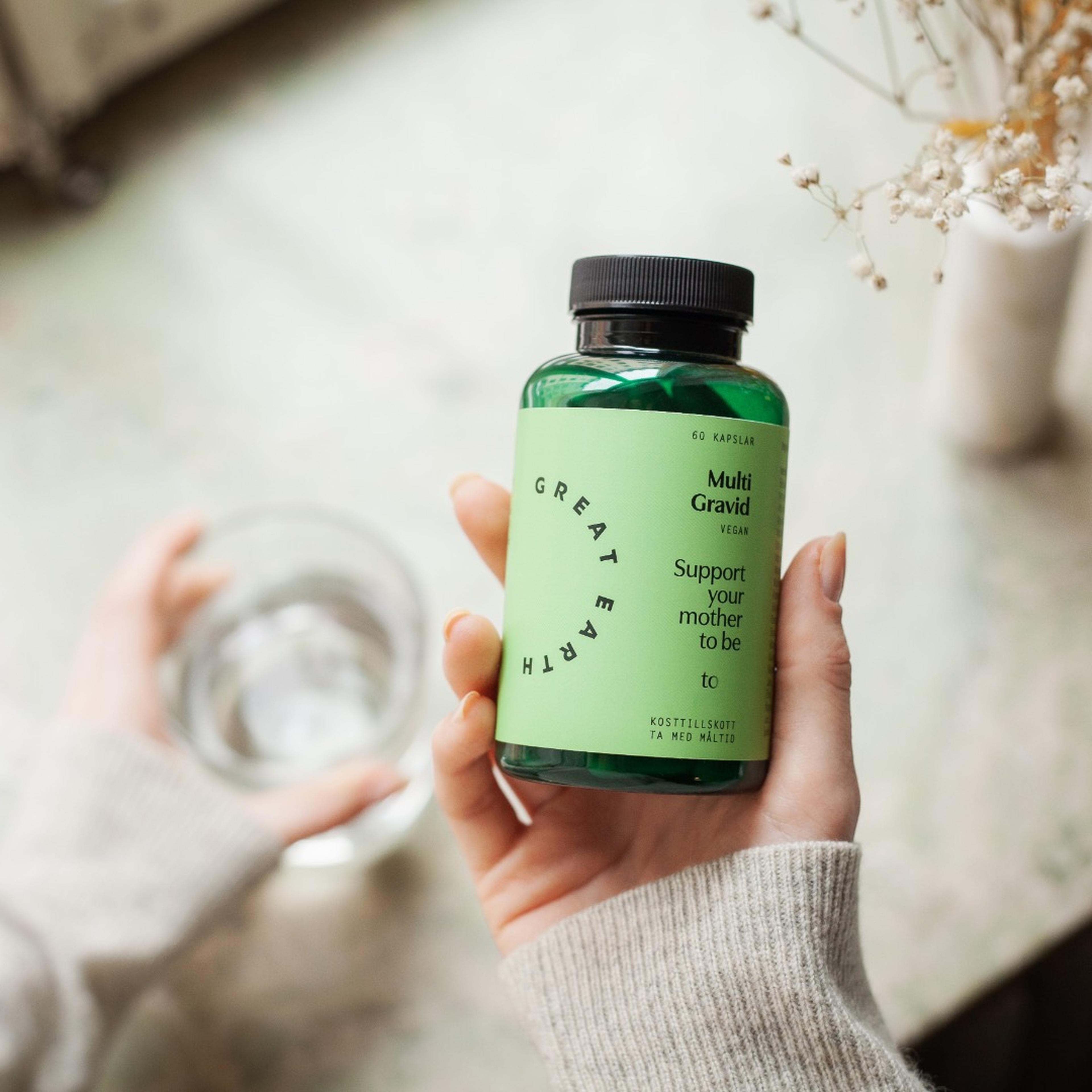 Frågor som; Vad vill jag äta? Vad får jag äta? Vad bör jag äta? Vad ska jag absolut inte äta eller dricka, är helt normala. Och när det kommer till kosttillskott kan det vara en djungel, men vi har flera olika tillskott som kan vara bra för dig under graviditeten. Bland annat Multi Gravid som är en multivitamin speciellt anpassad utifrån nordiska näringsrekommendationer för gravida och ammande kvinnors näringsbehov. Den innehåller en hel rad vitaminer och mineraler som du kan behöva lite extra av just nu. Ett annat bra tillskott är Omega 3, som bidrar till att hjärnan och ögonen hos fostret utvecklas normalt. Den fungerar även utmärkt för dig som är vegan, då vår Omega 3 kommer från mikroalger som odlas på land, och är därför ren från eventuella tungmetaller och andra oönskade ämnen. Och sist men inte minst Dophilus 15. Då bebisen får mammans tarmflora vid förlossningen, kan det vara bra att tillföra goda bakterier till magen under graviditeten.