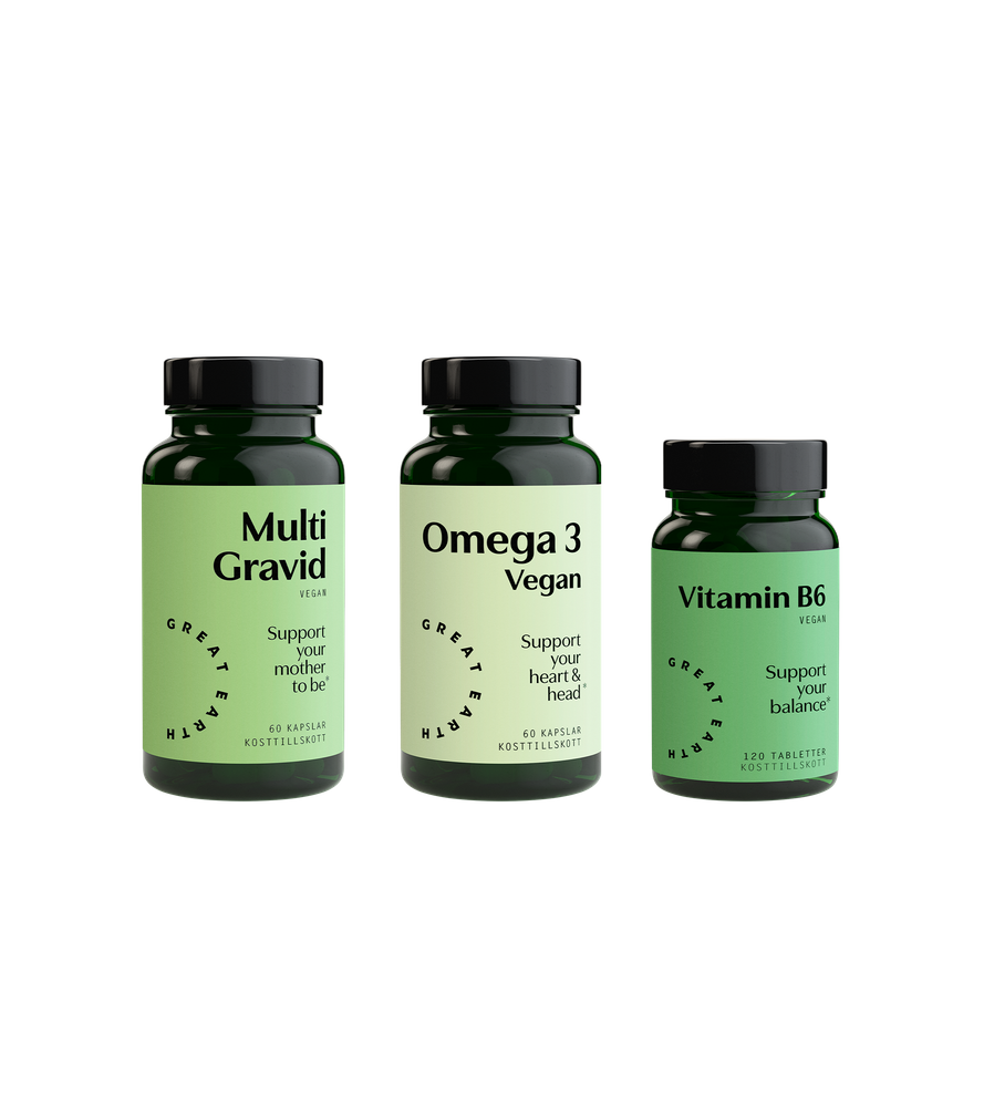 The first trimester (weeks 1-14) is a magical time when the foundation for your baby is laid. At the same time, many experience nausea. Based on current research and the Nordic Nutrition Recommendations (NNR) for pregnant women, our product expert has put together a bundle focused on just this.What’s included in the bundle?
